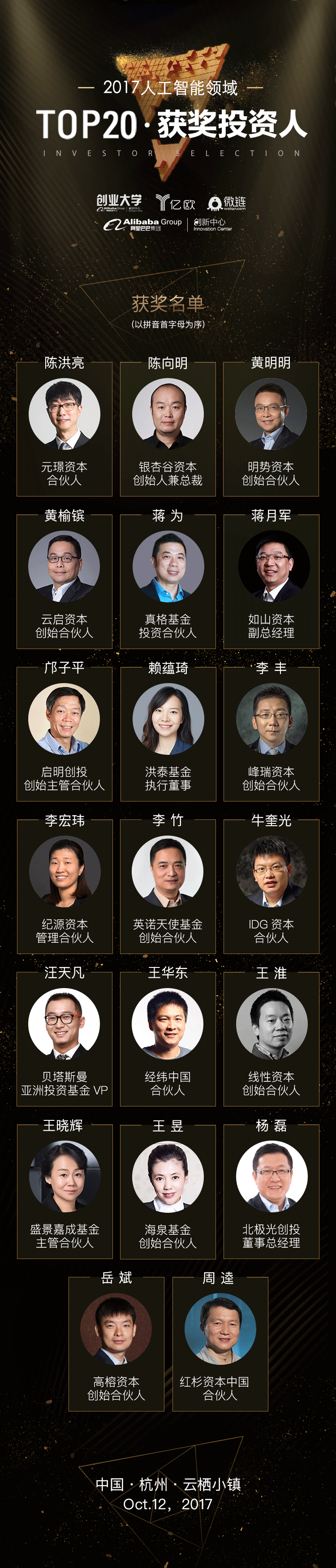本次投资人评选经公开征集报名,由大众投票结合专业评审得出。评审团由阿里云事业群副总裁任庚、阿里巴巴人工智能实验室总经理浅雪、思必驰董事长兼CEO高始兴、GrowingIO联合创始人兼CEO张溪梦、Xtecher创始人兼CEO戚宗超等行业专家、著名学者、知名媒体共同组成,最终评选出2017人工智能领域TOP20·投资人。